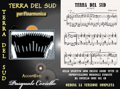 TERRA DEL SUD, valzer etnico con frasi jazzistiche ed armonie contemporanee particolari, brano davvero incantevole per gli amanti della musica. Nnello spartito PDF vi sono scritte anche tutte le improvvisazioni originali suonate da Pasquale Coviello nel suo CD. Se ordinate questo spartito riceverete in allegato "omaggio" anche la traccia audio registrata da Coviello con la sua fisarmonica. Questo spartito fa parte della collana "spartiti Prestige"spartito per fisarmonica molto fresco e virtuoso,.Il materiale ordinato lo riceverete dopo aver effettuato l'ordine direttamente sul vostro indirizzo email, o nel caso fosse più di uno spartito riceverete un link con password per potervi collegare ad una pagina protetta su cui poter scaricare in tutta comodità il materiale ordinato!